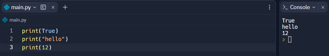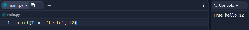 print(True, "hello", 12)