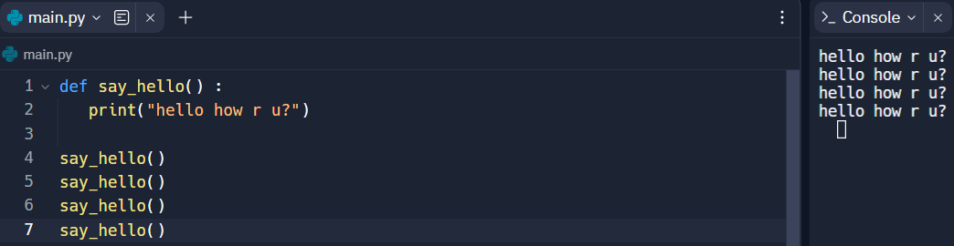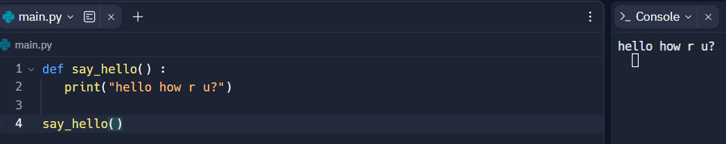 누가 say_hello function 이용하면(=호출(Call)하면) hello how r u를 출력해주게 됨