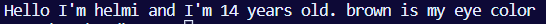 print(f"Hello I'm {my_name} and I'm {my_age} years old. {my_color_eyes} is my eye color")