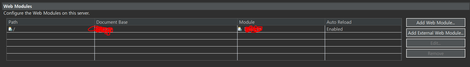 2) 톰캣 [server] 탭 - 하단부 [Modules] - [Edit] - [path] 수정하는 방법 > 이것도 안통했다.