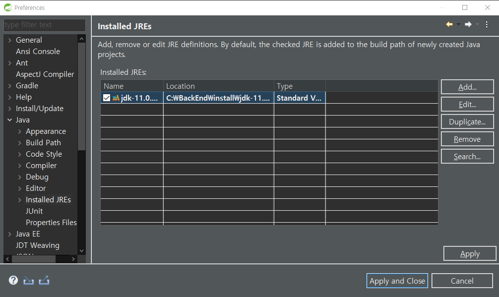 5) [Window] - [Preferences] - [Installed JREs] 화면에서 JRE 또는 JDK가 연결되었는지, 경로가 올바르게 설정되었는지 확인 및 자바 버전 확인