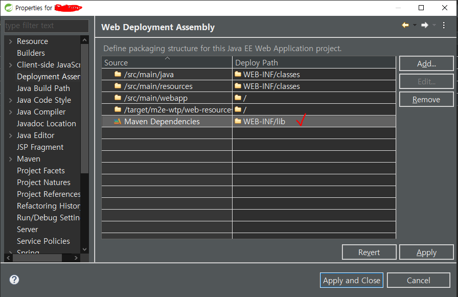 3) [properties]에 [Maven Dependencies]에 [WEB-INF/lib]이 없다면 추가