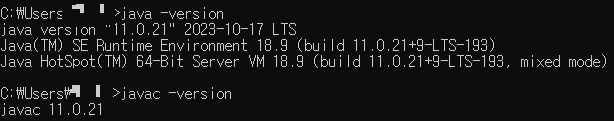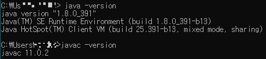 8) 만일 재설치 이력이 있는 경우, java -version과 javac -version을 cmd로 확인해봤다. 위 사진 같이 안맞으면 다시 설정해주고, 동일하다면 통과