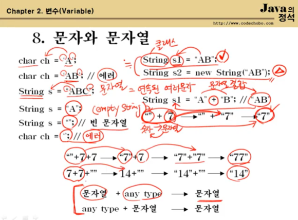 자바의 정석 ch2 (7-9) 문자, 문자열 리터럴, 문자열 결합 / 두 변수 바꾸기 본문