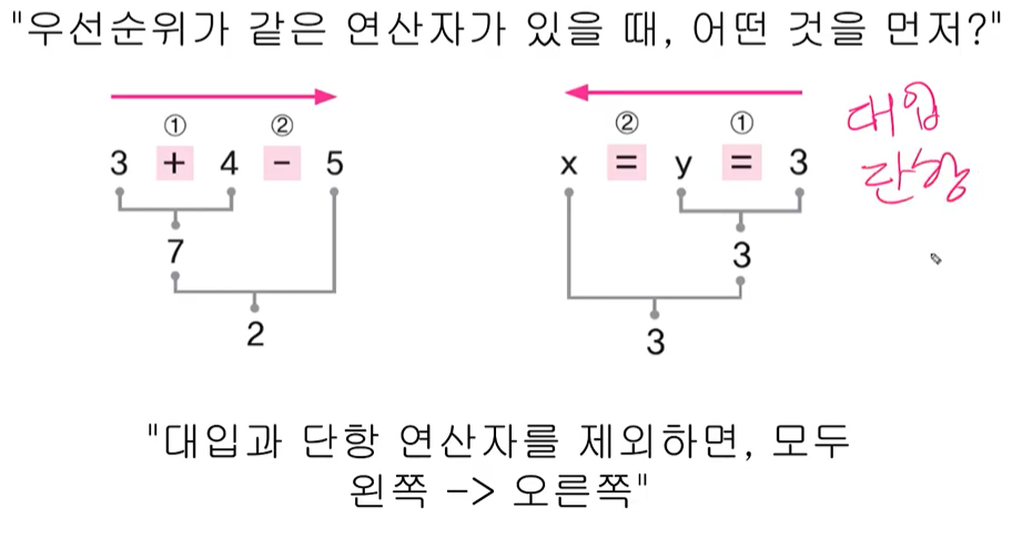 : 대입과 단항 연산자를 제외하면 모두 왼쪽 -> 오른쪽