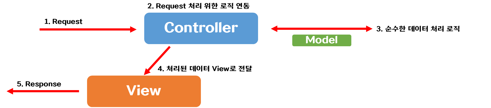 모델 2 방식에서 사용자의 Request는 특별 상황 아닌 이상 먼저 Controller 호출. 이렇게 설계하는 가장 중요한 이유는 나중에 View 교체하더라도 사용자가 호출하는 URL 자체에 변화 없게 만들어주기 때문. 컨트롤러는 데이터를 처리하는 존재 이용해 데이터(Model) 처리하고 Response 할 때 필요한 데이터를 View 쪽으로 전달. Servlet 이용하는 경우 개발자들은 Servlet API의 RequestDispatcher등 이용해 직접 처리해 왔으나 스프링 MVC는 내부에서 이런 처리 하고, 개발자들은 스프링 MVC의 API 이용해 코드 작성함