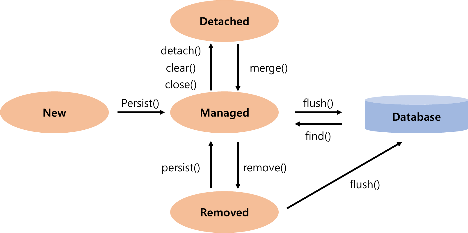 | 준영속 상태 (detached) | 영속성 컨텍스트에 엔티티 저장되었다가 분리된 상태 |