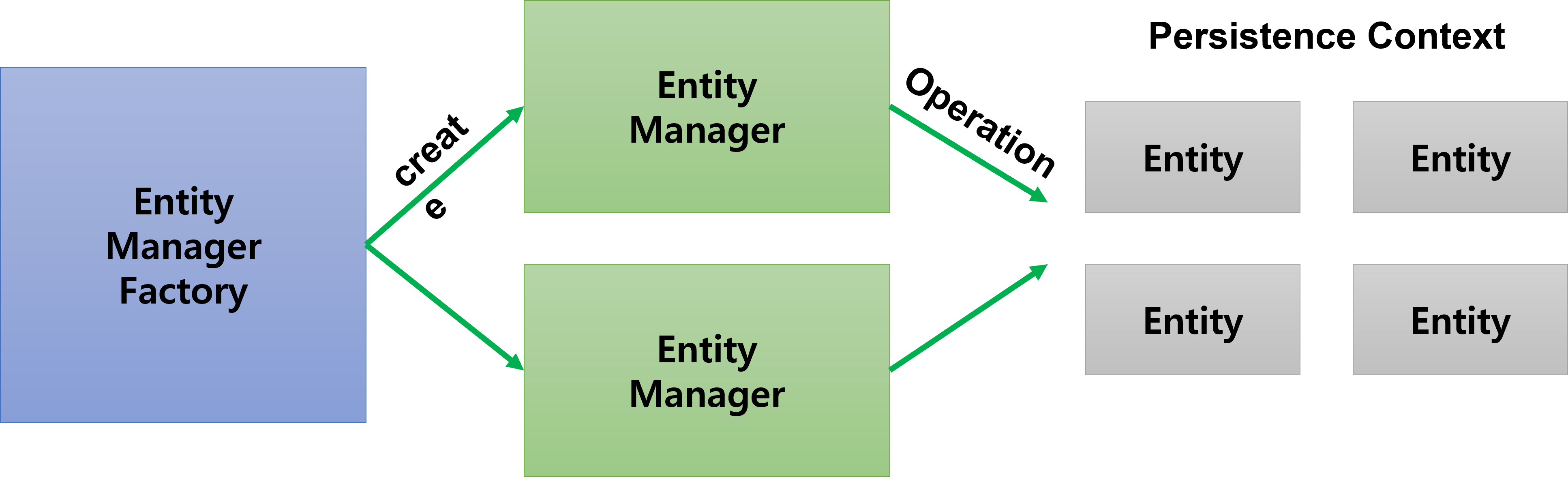 엔티티 메니저 인스턴스 관리 주체. 애플리 케이션 실행시 한 개만 만들어지며 사용자로부터 요청 오면 엔티티 매니저 생성