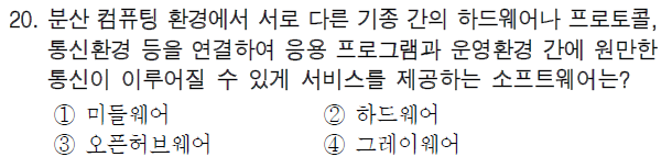 미들 웨어 : 서로 다른 기종간의 하드웨어나 프로토콜, 통신환경 등을 연결해 응용 프로그램과 운영환경 간에 원만한 통신 이뤄질 수 있게 서비스 제공하는 소프트웨어.