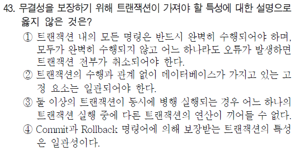 - 트랙잭션의 연산은 데이터베이스에 모두 반영되도록 완료(Commit)되든지 아니면 전혀 반영되지 않도록 복구(Rollback)되어야 한다.