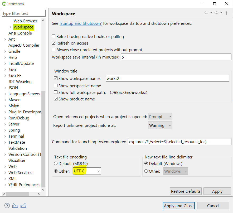 2. Window → preferences → Workspace → 왼쪽 하단 UTF-8로 변경